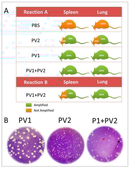 Detection of VAC-BR GI and GII in infected Balb/C mice: (A) qPCR detection of viral DNA from VACV A56R gene in mice spleen and lung samples. The results of Reaction A and Reaction B are represented. (B) Plaque phenotype assays of monoinfected (PV1-GII and PV2-GI) and coinfected mice showed two viral populations: small plaques-PV2 (red arrows) and large plaques-PV1 (black arrows). PV1-GII: Pelotas virus 1; PV2-GI: Pelotas virus 2; PBS: phosphate-buffered saline.