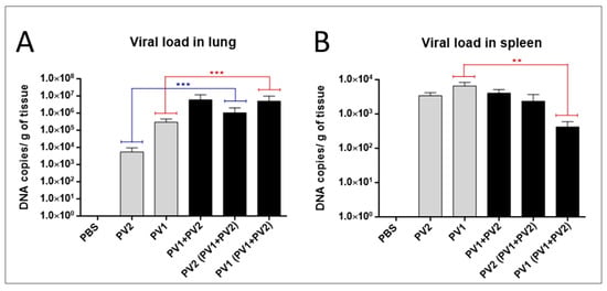 Viral load in mono or coinfected PV1-GII and PV2-GI mice. Viral loads in: lungs (A); and spleen (B) of Balb/c mice monoinfected (grey columns) and coinfected (black columns) with PV1-GII and PV2-GI were determined by qPCR. Comparisons between mono and coinfected groups are highlighted in red (PV1-GII groups) and blue (PV2-GI groups). The error bars indicate standard deviations. The statistical tests used were One-Way ANOVA and Tukey’s multiple comparisons test Asterisks indicate a statistically significant difference: ** p < 0.01; *** p < 0.001. PV1: Pelotas virus 1; PV2: Pelotas virus 2; PBS: phosphate-buffered saline.