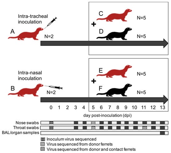 Schematics overview of the experimental design; ferret groups are lettered (A–F); red ferrets are immunocompromised ferrets; black ferrets are immunocompetent ferrets; contact ferrets (group C–F) are placed in the same cages as donor ferrets (group A,B) on day 5 post-inoculation (dpi); all ferrets are euthanized at 13 dpi. Days of collection of nose swabs, throat swabs, broncho-alveolar lavages (BAL), and respiratory tract samples are indicated with dark squares; samples used for viral sequencing are indicated with patterns.