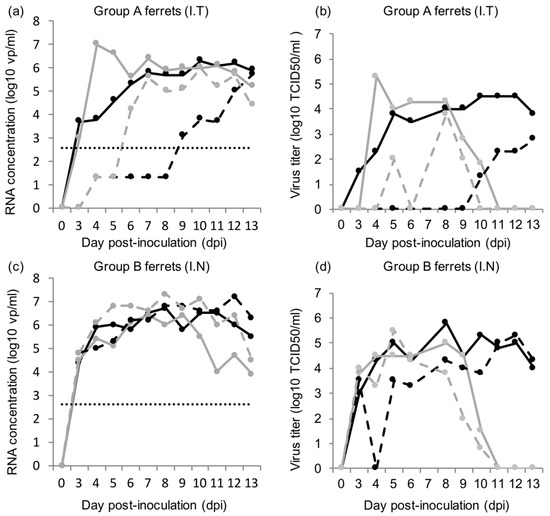 HRSV RNA concentrations and viral titers in the throat and nose swabs of donor ferrets; (a) HRSV concentration in the throat swabs (plain line) and nose swabs (dashed line) of group A ferrets inoculated intra-tracheally (I.T); (b) HRSV viral titers in the throat swabs (plain line) and nose swabs (dashed line) of group A ferrets inoculated intra-tracheally (I.T); (c) HRSV concentration in the throat swabs (plain line) and nose swabs (dashed line) of group B ferrets inoculated intra-nasally (I.N); (d) HRSV viral titers in the throat swabs (plain line) and nose swabs (dashed line) of group B ferrets inoculated intra-nasally (I.N); each line represents a single ferret; for (a,c): quantification limit of qPCR data is indicated by a dotted line, and non-quantifiable Ct values were assigned the value 1.3 log10 vp/mL.