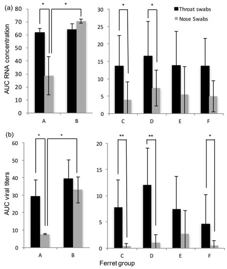 Average RNA concentrations and viral titers in the throat and nose swabs of group A to F ferrets, expressed as areas under the curve (AUC); (a) AUC RNA concentration; (b) AUC viral titers; significant differences are marked with asterisks (* p ≤ 0.05 and ** p ≤ 0.01); error bars indicate standard deviations.