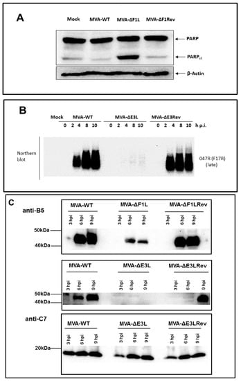 Confluent monolayers of HeLa cells or NIH/3T3 cells were infected at a multiplicity of infection (MOI) of 5 with Modified Vaccinia virus Ankara (MVA) (clonal isolate F6), MVA-ΔF1L, MVA-ΔE3L and revertant viruses. Cell lysates were prepared at different time points after infection (3, 6, 9, 15 h post-infection (hpi). Lysates from uninfected cells or wild-type MVA-infected cells served as controls. Polypeptides were separated by sodium dodecyl sulfate polyacrylamide gel electrophoresis (SDS-PAGE) and electroblotted onto a polyvinylidene difluoride (PVDF) membrane. After blocking, membranes were incubated with primary antibodies (rabbit anti-B5 diluted 1:500; rabbit anti-C7 diluted 1:1000; rabbit anti-poly(ADP-ribose)polymerase (PARP) Cell Signaling Technology (Danvers, MA, USA) diluted 1:1000; mouse anti-β-Actin Sigma-Aldrich (St. Louis, MI, USA) diluted 1:1000) at 4 °C overnight. After washing, the blots were incubated with secondary antibodies for one hour at room temperature.