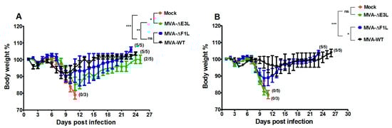 Protective capacity of MVA vaccination against lethal mousepox virus infections. C57BL/6 mice were challenged with 2000 plaque forming units (pfu) ECTV 21 days after immunization with MVA vaccine at a dose of 106 pfu (A) or a dose of 105 pfu (B) or PBS (mock vaccinated animals, used as controls). In all experiments, weight loss of individual mice was monitored daily (three to five per group). Error bars indicate standard errors of the means (SEMs), and the numbers of surviving/total animals are given in parentheses. * p < 0.05; ** p < 0.01; *** p < 0.001. Data are representative of two or three experiments.