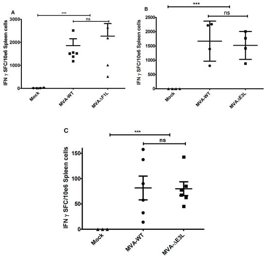 Virus-specific CD8+ T cells elicited by MVA vaccination. C57BL/6 mice were inoculated intramuscularly with 106 pfu MVA, MVA-ΔF1L (A), MVA-ΔE3L (B), or PBS. At eight days post-vaccination, splenocytes were prepared, and B8R20–27-specific IFN-γ-producing CD8+ T cells were measured by Enzyme Linked Immuno Spot Assay (ELISPOT). Virus-specific CD8+ T cell memory responses elicited by MVA-WT, MVA-ΔE3L vaccination or PBS in C57BL/6 mice (n = 3–6 per group) (C). Splenocytes were prepared at 56 days after prime vaccination. B8R20–27–epitope-specific, IFN-γ spot forming CD8+ T cells (IFN-γ SFC) were quantified by ELISPOT. Data are representative of two similar experiments. *** p < 0.001; ns, not significant.