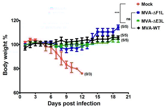 Short-term protective capacity of MVA vaccination against lethal mousepox virus challenge infection. Groups of C57BL/6 mice (n = 5) were inoculated with 200 pfu ECTV two days after immunization with 105 pfu of MVA, MVA-ΔF1L, or MVA-ΔE3L. PBS vaccinated animals (n = 3) served as controls (Mock). In all experiments, weight loss of individual mice was monitored daily. Error bars indicate standard errors of the means (SEMs), and the numbers of surviving/total animals are given in parentheses. *** p < 0.001. Data are representative of two or three experiments.