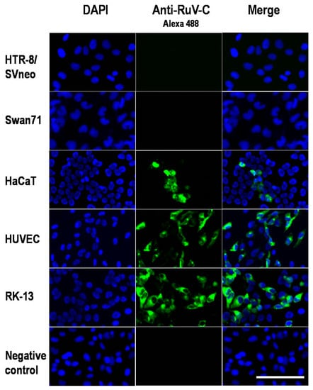 Cells cultured on glass coverslips in six-well plates (2 × 105 cells/well) were washed with phosphate buffered saline (PBS) and infected with RuV for 1 h at room temperature (RT). After a 1 h adsorption, appropriate medium supplemented with 2% FBS, either RPMI (for HTR8/SVneo cells) or DMEM (for Swan71 and HaCaT cells), was added, and the cells were incubated at 35 °C in a humidified 5% CO2 incubator. The next day, the supernatant was removed and replaced with fresh medium (2% FBS). Two days post-infection, the cells were subjected to immunofluorescence assays.