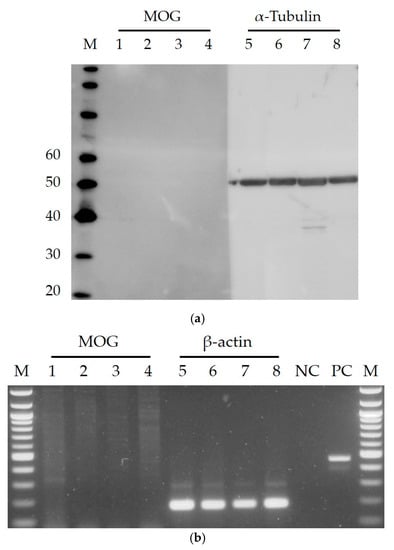 Total RNA was extracted from cells by using TRIzol (Invitrogen). The RNA concentration was quantified by using a nanodrop spectrophotometer at 260 nm. RT-PCR was performed using PrimeScript One Step RT-PCR Kit Version 2 (Takara Bio Inc., Otsu, Japan) and the following primers: for MOG: sense, 5′-TCC TCC TCC TCC TCC AAG TGT CT-3′; antisense, 5′-AGT GGG GAT CAA AAG TCC GGT GG-3′; for β-actin: sense, 5′-TGG CAC CCA GCA CAA TGA A-3′; antisense, 5′-CTA AGT CAT AGT CCG CCT AGA AGC A-3′. The PCR products were identified by electrophoresis on 1.5% agarose gels.