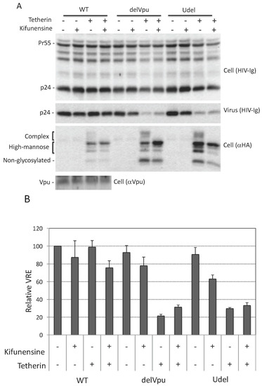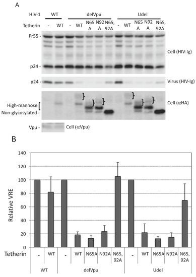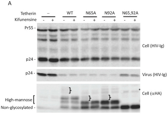 The full-length, infectious HIV-1 molecular clone pNL4-3 and the Vpu-defective counterparts pNL4-3delVpu and pNL4-3Udel have been described previously [60,61,62]. pNL4-3delVpu and pNL4-3Udel were kindly provided by K. Strebel (National Institutes of Health (NIH), Bethesda, MD, USA). Vectors expressing tetherin derivatives bearing an N-terminal hemagglutinin (HA) epitope tag or an HA tag inserted at residue 154 in the extracellular CC domain of tetherin have been described previously [1,15] and were generously provided by P. Bieniasz (The Rockefeller University, New York, NY, USA). PCR-based mutagenesis was used to introduce Ala substitutions at either one or both of two Asn residues (N65A, N92A, and N65,92A) that are targets for N-linked glycosylation. Anti-HA antiserum, kifunensine, and tunicamycin were purchased from Sigma (St. Louis, MO, USA). Alexa Fluor 488 or 594-conjugated secondary antibodies were from Invitrogen (Grand Island, NY, USA). Anti-Vpu, anti-tetherin, and anti-HIV-1 immunoglobulins (Ig) were obtained from the NIH AIDS Research and Reference Reagent Program.