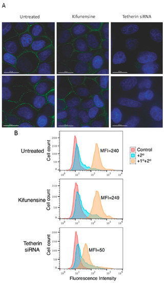 Complex-type glycosylation of tetherin is dispensable for tetherin cell-surface expression. (A) HeLa cells were plated in eight-well chamber slides; one day after plating cells were either treated with small interfering RNA (siRNA) to knock-down tetherin expression or treated with 10 μM kifunensine for 24 h. Cells were fixed, stained with anti-tetherin primary antibodies followed by the Alexa Fluor 488-conjugated secondary antibody as detailed in the Materials and Methods Section, and were examined with a Delta-Vision RT deconvolution microscope (GE Healthcare Life Scienes, Pittsburg, PA, USA). Tetherin staining is shown in green and 4′,6-diamidino-2-phenylindole (DAPI) in blue. Scale bars represent 15 μm; (B) HeLa cells in 12-well plates were treated as in Figure 4A, cells were harvested and stained with anti-tetherin antisera followed by Alexa Fluor 488-conjugated secondary antibody (+1°+2°) or were stained with secondary antibody alone (+2°) and analyzed with a Becton Dickinson FACS Calibur flow cytometer as in Figure 2A. The number of events (cell count) is shown on the y-axis. MFI, mean fluorescence intensity; (A,B) Representative data from three independent experiments are shown.