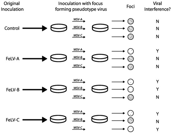 Viral interference assays were used to distinguish and initially define FeLV subgroups A, B and C, presumably via intrinsic mechanisms. FeLV viruses that “interfere” with one another (i.e., virus A precludes superinfection with virus B) were tested by a classical method to identify viral groups of the same subgroup (which interfere) versus viruses of different subgroups (which do not interfere) [41,42]. In 1971, Sarma and Log used interference assays to establish the first three recognized FeLV subgroups: A, B and C (Figure 2) [19]. Focus-forming FeLV/murine sarcoma virus (MSV) pseudotypes (viral chimeric constructs in which MSV envelope proteins have been replaced by FeLV env) were produced by rescue of 9 natural tumorigenic FeLV isolates following co-culture on Harvey MSV-infected hamster tumor cells and feline embryonic fibroblasts. Subsequent in vitro infection of feline embryo fibroblasts with one subgroup resulted in the blockage of the corresponding pseudotype. Cell cultures were considered to demonstrate viral interference if a 2-log drop in focus forming titer was measured. For example, when feline embryo fibroblast cultures were infected with FeLV-A, they were still susceptible to FeLV-B and C pseudotypes (i.e., foci were present following secondary infection). Additionally, cells infected with FeLV-C were susceptible to FeLV-B pseudotype infection, and vice versa (Figure 2). These experiments led to the conclusion that FeLV-A, B and C were genetically different and capable of superinfection in cells.