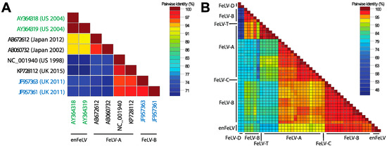 Pairwise identity across FeLV subytpes. (A) Full genomes of enFeLV (green font), FeLV-A (black font), and FeLV-B (blue font) document discrimination of two major groups (indicated by blue/green grid and yellow/red grid). Pairwise identify is indicated by color scale of intersecting grid blocks. FeLV-A is highly conserved (>94% pairwise identity), though two subgroups are indicated by red versus yellow-orange grid colors. Isolates demonstrate great variation between clades (70–77% pairwise identity with highest conservation in gag and pol), although genetic similarity is not entirely driven by subgroup; (B) pairwise identity of the env genes demonstrates that this region is most divergent among FeLV subgroups. Sequence accession numbers used for analysis: enFeLV—AY364318-9, M25425; FeLV-A—AB060732, AB635483, AB635500, AB635510, AB635516, AB672612, EU359303-6, EU359308-9, KP728112, M12500, M18247-8, M89997; FeLV-B—AB635492, AB635494, AB635499, AB635502, AB635506, AB635512, AB635517, AB635526, AB635579, AB635581, AB635638, AF403716, J03448, JF957361, JF957363 K01208-9, V01172, X00188; FeLV-C—M14331; FeLV-D—AB673426, AB673432; FeLV-T—M18246.