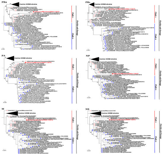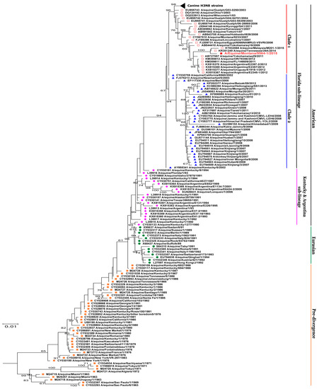 - Lai, A.C.K.; Chambers, T.M.; Holland, J.R.E.; Morley, P.S.; Haines, D.M.; Townsend, H.G.G.; Barrandeguy, M. Diverged evolution of recent equine-2 influenza (H3N8) viruses in the Western Hemisphere. Arch. Virol. 2001, 146, 1063–1074. [Google Scholar] [CrossRef] [PubMed]
