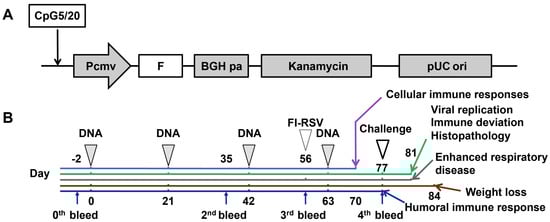 Construction of the modified DNA plasmids with multiple copies of CpG motif, and animal experiment schedule. (A) pVAX1 was modified by insertion of five or 20 copies of C-type of CpG ODN in 5′ end of cytomegalovirus (CMV) promoter (Pcmv), and then the codon optimized fusion glycoprotein (F) of human respiratory syncytial virus (RSV) was constructed into this vector, the resulting recombinant plasmids were designated pVAX1-CpG5-F and pVAX1-CpG20-F, respectively; (B) groups of five mice were immunized via the intramuscular (i.m.) route in the thigh (quadriceps) with 30 μg of either pVAX1-F, pVAX1-CpG5-F, or pVAX1-CpG20-F, and boosted three times at 3-week intervals. The phosphate buffered solution (PBS, 100 μL/mouse) immunized mice were used as negative control mice (NC). T-cell responses were determined by enzyme-linked immunospot assay (ELISPOT) 7 days after the last immunization (purple line, day 70) and serum binding and neutralizing antibodies were measure at various times points (blue lines, days 2, 35, 56, and 77). For one challenge studies, vaccinated mice were administered 1 × 106 plaque forming units (PFU), or 2 × 106 PFU, by the intranasal (i.n.) route14 days after the last immunization (open arrow, day 77). Lung RSV titer, lung cytokines, and lung histopathology were analyzed 4 days after challenge (green arrow, day 81). Weight loss was assessed for 7 days after challenge. The enhanced respiratory disease (ERD) after formalin-inactivated, alum adjuvanted RSV (FI-RSV) vaccination was assessed in mice challenged with 1 × 106 PFU of RSV 21 days after one dose of FI-RSV vaccine. Histopathology studies for ERD were done at 4 days after challenge.