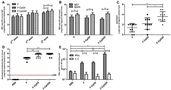 - Hancock, G.E.; Heers, K.M.; Smith, J.D.; Scheuer, C.A.; Ibraghimov, A.R.; Pryharski, K.S. CpG containing oligodeoxynucleotides are potent adjuvants for parenteral vaccination with the fusion (F) protein of respiratory syncytial virus (RSV). Vaccine 2001, 19, 4874–4882. [Google Scholar] [CrossRef]