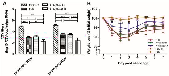 Lung virus titers and body weight changes in vaccinated mice after RSV challenge. BALB/c mice (n = 5) were immunized 4 times via (i.m. route with either pVAX1-F (30 μg/dose/mouse), pVAX1-CpG5-F (30 μg/dose/mouse), pVAX1-CpG20-F (30 μg/dose/mouse), or PBS (NC, 100 μL/mouse). (A) The vaccinated mice were intranasally challenged with 1 × 106 (experiment 1) or 2 × 106 (experiment 2) PFU at 14 days after the 4th vaccination. RSV copies per microgram RNA from lung homogenates detected by real-time quantitative polymerase chain reaction (RT-qPCR) and expressed as log10 RSV-copies/μg RNA; (B) the body weight changes were monitored and calculated daily as a percentage of starting weight for 7 days post 1 × 106 PFU RSV challenge, the symbol of either #, +, or * indicated significant difference (p < 0.05) compared with mice in the group of PBS-R, F-R, or F-CpG5-R; ## indicated p < 0.01. Data showed mean ± SD, analyzed by two-way analysis of variance (ANOVA) in GraphPad Prism, and each point of data represented an individual animal. ** p < 0.01, *** p < 0.001. F: pVAX1-F; F-CpG5: pVAX1-F-CpG5; F-CpG20: pVAX1-F-CpG20; R: challenge.