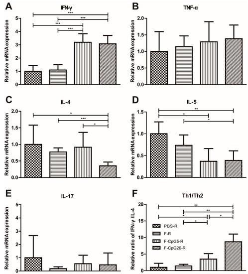 Cytokine production in lungs of immunized mice after 4 day of RSV challenge. BALB/c mice (n = 5) were immunized 4 times via i.m. route with either pVAX1-F (30 μg/dose/mouse), pVAX1-CpG5-F (30 μg/dose/mouse), pVAX1-CpG20-F (30 μg/dose/mouse), or PBS (NC, 100 μL/mouse). The vaccinated mice were intranasally challenged with 1 × 106 PFU of RSV after 14 days of last immunization. The messenger RNA (mRNA) levels of IFN-γ (A); tumor necrosis factor alpha (TNF-α) (B); IL-4 (C); IL-5 (D); and IL-17 (E) were tested with RT-PCR and were normalized relative to glyceraldehyde phosphate dehydrogenase (GAPDH). The formula (mRNA expression = 2−ΔΔCt, Ct is the cycle threshold) was used to calculate the cytokine secretion level of each group; (F) Ratios of IFN-γ/IL-4 were calculated to illustrate the polarization of immunized mice upon challenge. Data showed mean ± SD, analyzed by two-way ANOVA in GraphPad Prism. * p < 0.05, ** p < 0.01, *** p < 0.001. F: pVAX1-F; F-CpG5: pVAX1-F-CpG5; F-CpG20: pVAX1-F-CpG20; R: challenge.