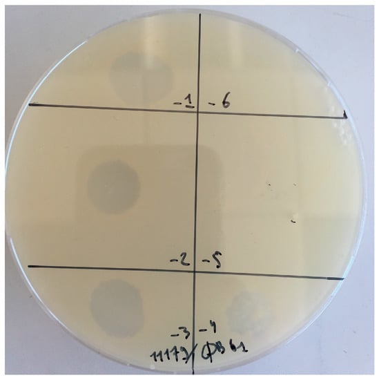 We explored the presence of phages infecting AAB in 30 enological samples. As shown in Table 2, the samples corresponded to musts, PDC and wines collected during the 2013 and 2014 vintages from various wineries, making red, dry white and sweet Bordeaux (Sauternes) wines [38]. Each of the 30 samples was tested against a panel of 17 isolates belonging to the two main genera of AAB associated with wine making, namely Gluconobacter and Acetobacter (Table 1). During the survey, a juice sample collected during dry white wine making, produced a few plaques on strain Gluconobacter cerinus CRBO11179. A single plaque was subsequently isolated and a pure stock of phage GC1 was prepared following three successive rounds of plaque purification. A high titre phage stock was prepared by liquid infection in YPMΦ broth. Optimal infection was observed at an MOI value of 0.003 and the phage titres as high as 1010 PFU mL−1 in the lysate were obtained after 6 h of incubation at 30 °C. As seen in Figure 1, phage GC1 produced turbid plaques on its host.