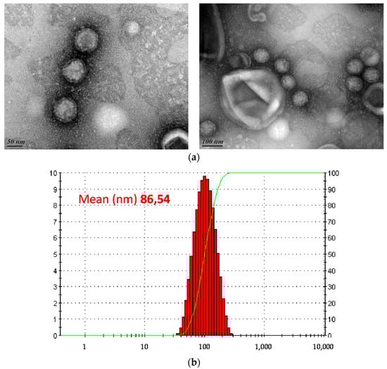 Figure 2. Morphology and size of BG1 particles. (a) Transmission electron micrographs of phage GC1. Scale bars are 50 nm (left) and 100 nm (right); (b) Average size (nm) of the particles in dynamic light scattering (DLS) analysis, using a Zetasizer Z/S system (Malvern, UK).