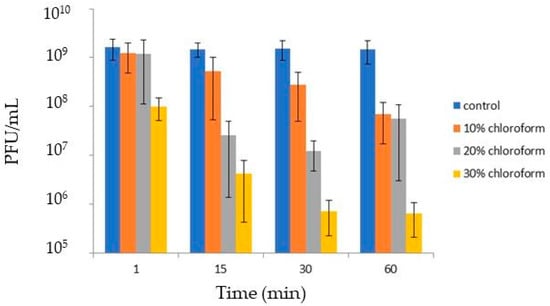 Figure 4. Sensitivity of GC1 to chloroform. The phage lysate was added with chloroform (10%, 20% or 30%). After incubation for 1, 15, 30 or 60 min at room temperature, PFU were enumerated.