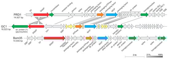 Homology searches were performed using a combination of BLASTP [45] as well as a more sensitive hidden Markov model (HMM)-based HHpred program [46] and the CD-search against the Conserved Domains Database at NCBI [47]. Searches using the BLASTP program revealed that only eight (22%) of GC1 gene products are significantly similar (cut-off of E = 1 × 10−3) to sequences in the non-redundant protein database (Table S1). The closest homologs for five of these proteins (ORFs 2, 9, 12, 16 and 17) were encoded by members of the genus Alphatectivirus (Tectiviridae). These included the key proteins involved in DNA replication (protein-primed family B DNA polymerase (DNAP)) as well as in virion structure and assembly (major capsid protein, genome packaging ATPase and two minor structural proteins). Considering the short length of most of the GC1 proteins, the BLASTP search database was restricted to the family Tectiviridae (taxid: 10656). This adjustment resulted in identification of five additional putative homologs conserved between GC1 and alphatectiviruses (Table S1). The homologous genes occupied equivalent positions within the GC1 genome when compared to the genomic layout of other tectiviruses, with a notable inversion of the region encompassing the genes for the DNAP and putative terminal protein (Figure 5), which in viral genomes is typically encoded immediately upstream of the DNAP [59].