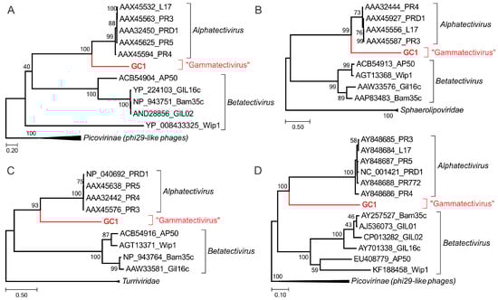 To explore the position of GC1 within the family Tectiviridae, we performed maximum likelihood phylogenetic analysis of the three key proteins—MCP, packaging ATPase and DNAP—conserved in all members of the family. In all cases, GC1 formed a well-supported sister group to the closely related PRD1-like tectiviruses from the genus Alphatectivirus (Figure 6a–c). Next, we calculated pairwise intergenomic distances between all sequenced tectiviruses with the Genome-BLAST Distance Phylogeny (GBDP) method using VICTOR tool [51]. This genome-wide comparison also placed GC1 as a deep-branching sister group to PRD1-like tectiviruses (Figure 6d). Consistently, sequence analysis of the GC1 gene products (Figure 5, Table S1) suggest that the virus is most closely related to PRD1-like phages of the genus Alphatectivirus. However, unlike other alphatectiviruses, GC1 is a temperate phage. Furthermore, pairwise comparison of GC1 with other alphatectiviruses using BLASTN, as recommended by the ICTV (International Committee of Viruses) Bacterial and Archaeal Viruses Subcommittee (PMID: 26733293), did not reveal common regions of sufficient similarity at the nucleotide level. Collectively, these results confirm that GC1 is a highly divergent member of the family Tectiviridae, which cannot be placed into either existing genus based on the recommended demarcation criteria [23]. Thus, we propose that GC1 represents a new genus within the Tectiviridae, which we tentatively named “Gammatectivirus”. Interestingly, GC1 helps to bridge the gap in the sequence space between alphatectiviruses and betatectiviruses. For instance, in a PSI-BLAST search seeded with the MCP sequence of GC1, all alphatectiviruses and betatectiviruses were recovered after three iterations (E < 0.01), whereas the leap to betatectiviruses was not possible when the search was seeded with the MCP sequence of PRD1-like phages.