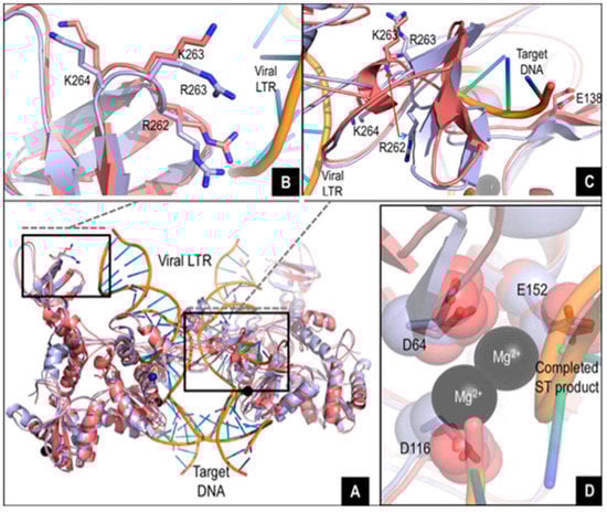 In silico studies of the wild-type and R263K integrases (A–D) adapted from Figure 4 of reference [2]. Overlay of the wild-type and R263K integrases, intasome and strand transfer complex models with viral LTR DNA and target DNA. The tetrameric IN structure is composed of the inner and outer subunits; (B) Detailed view (8 Å) of the overlay showing proximity between residue 263 in one of the outer subunits and the viral LTR; (C) Detailed view (12 Å) showing the pronounced shift in localization and orientation of residue R262 in the presence of the R263K mutation at the vicinity of the target DNA in one of the inner subunits; (D) Close-up overlay showing the relative positions of the D64D116E152 core catalytic residues in the wild-type and R263K enzymes in the inner subunits.