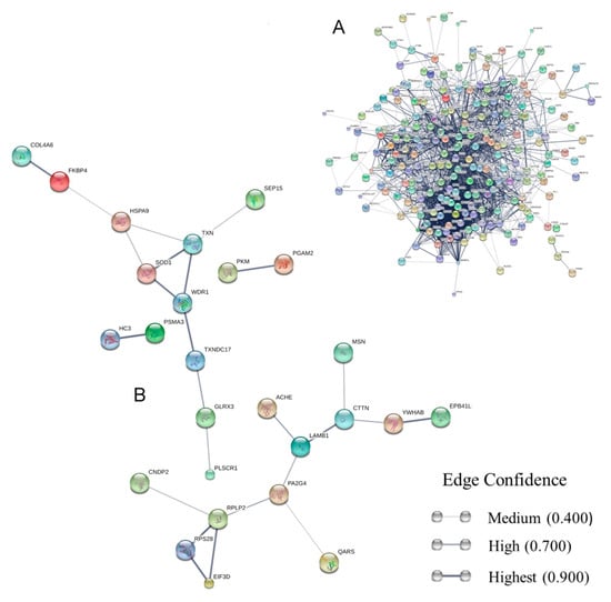 Secretome networks showing predicted functional linkages between identified proteins. (A) Interaction map of the whole LL5 double-stranded RNA (dsRNA)-transfected cell exoproteome; (B) interactome map of the secreted proteins with positive variation of ≥2-fold change. The STRING interactome maps were generated using default settings (medium confidence of 0.4, with 7 criteria for linkage: neighborhood, genefusion, co-occurrence, co-expression, experimental evidence, existing databases, and textmining). Proteins were represented as nodes and their functional links were defined by solid lines. The thickness of the lines signifies the level of confidence of the reported association. The non-connected nodes were suppressed. No additional interplay proteins were added to the networks. The protein symbols and node colors are listed in Table S2.