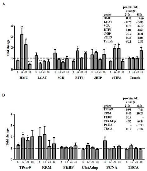 Transcriptional profile of genes involved in antiviral response. (A) Genes with correlated transcriptional and protein secretion profiles on mass spectrometry at 24 h or 48 h post-transfection; (B) genes with non-correlated transcriptional and protein secretion profiles on mass spectrometry on mass spectrometry at 24 h or 48 h post-transfection. Y-axis represents fold change in gene expression relative to the mock-transfected group (horizontal traced line) normalized to the rp49 reference gene. The X-axis represents gene name (Table 1) and samples collected at different time points post-transfection. Quantification was normalized relative to the house keeping gene rp49, and relative gene expression expressed as fold change was calculated relative to the mock group. Bars represent mean with standard error (SEM) of two biological replicates. Tables represent protein fold change corresponding to each gene name. * p ≤ 0.05, ** p ≤ 0.01, *** p ≤ 0.001.