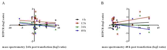 Comparison of transcript and secreted protein abundance. Mass spectrometry expression values (log2 ratio) of LL5 cell-secreted proteins collected at 24 h (A) or 48 h (B) post transfection were plotted on X-axis; mRNA levels obtained from qPCR (log2 ratio) of LL5 cells collected at 6 h (black circles), 12 h (red squares), 24 h (green triangles), and 48 h (blue diamonds) post-transfection were plotted on the Y-axis. Lines represent linear regression.