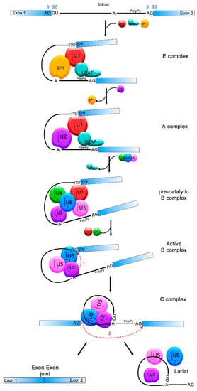 Briefly, the U1 small nuclear ribonucleoprotein (snRNP) binds to the 5′ splice site, allowing the binding of the splicing factor 1/mammalian branch point binding protein (SF1/mBBP) to the branch point and the interaction of the U2 Auxiliary Factor (U2AF) with the polypyrimidine tract, forming the E complex which approaches the 5′ and 3′ splicing sites. Then, the U2 snRNP associates with the branch point and induces the displacement of SF1/mBBP, leading to the formation of the A complex. Later, the pre-assembled complex, U4/U6/U5 tri-snRNP, is recruited, generating the pre-catalytic B complex. In this step, all snRNPs are catalytically inactive and require other rearrangements to induce the first splicing reaction. Afterwards, U1 and U4 are removed from the B complex while U2, U5 and U6 are rearranged, forming the active B complex. This complex is then catalytically activated by the DEAH (Asp-Glu-Ala-His)-box RNA helicase Prp2 (catalytically activated B complex). In this step, the phosphodiester bond at the 5′ splice site (exon-intron joint) is attacked and broken by the 2′-OH of the adenosine at the branch point, which creates a new bond between the 5′ side of the intron and the adenosine, forming the lariat structure. At this point the C complex is formed, which induces the catalysis of the second bond between the 3′-OH of the first exon and the 5′ acceptor site of the second exon (exon-exon joint). Finally, the intronic sequences are discarded, the exons come together and the spliceosome is disassembled [,,] (Figure 1).