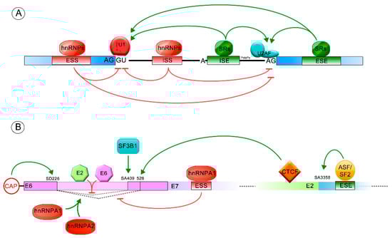 In addition, exonic and intronic splicing enhancers (ESEs and ISEs) and/or silencers (ESSs and ISSs) are required to regulate the splicing process: negatively, by the interaction with the heterogeneous ribonucleoproteins (hnRNPs) and positively, with serine/arginine-rich protein (SR). The hnRNPs (i.e., hnRNPA1 and hnRNPA2) bind mainly to the silencer elements, blocking the recognition of the exon-intron junctions by elements of the spliceosome. In contrast, the SR proteins (SRF1-12) usually bind to the enhancer sequences, acting as general activators of exon definition. The contribution of the SR and hnRNP proteins defines the overall recognition potential of an exon and/or the affinity for the spliceosome [,,,] (Figure 2A).