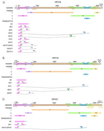 In low-risk HPVs the E6 and E7 genes are transcribed from two independent promoters, while in high-risk HPVs those genes are transcribed as a single polycistronic pre-mRNA from the early promoters. A common feature of high-risk HPVs is that the E6/E7 polycistronic mRNA contains at least one donor and one acceptor splicing site that can trigger the alternative splicing process, inducing the expression of a variety of E6 spliced transcripts termed E6* [,]. In contrast, low-risk HPVs and beta-papillomavirus types do not undergo splicing in this region [].