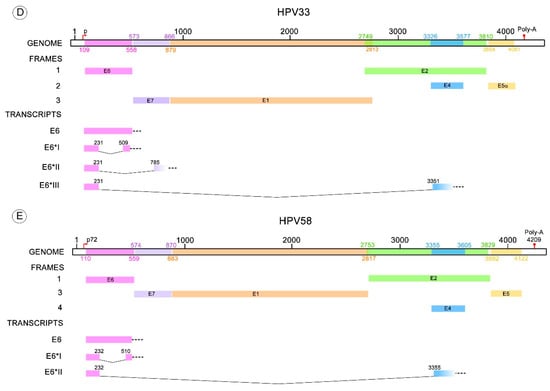 Many studies have described the E6/E6* patterns found in cervical cancer cell lines with endogenous expression of HPV or in cells with ectopic expression of HPV sequences. These patterns have also been identified in HPV infected biopsies with normal or altered cytology and in HPV-related cancers. Most of those studies are focused on the expression patterns of HPV16 and HVP18; although, information is available for other HR-HPV types such as, 31, 33 and 58 (Figure 3) [,,].