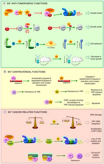 E6* isoform-related functions. Proposed E6* functions involved in (A) anti-tumorigenic effects, such as: increase in growth arrest through inhibition of E6-mediated p53 degradation and increase in p14 protein levels possibly through E6*/p53 interaction (?), increase in cell adhesion by the activation of β-integrin signaling and overexpression of E-cadherin, decrease in tumor growth associated with a reduction in VEGFR-1; (B) Controversial effects of E6* in apoptosis regulation; and (C) Carcinogenic characteristics, such as: promotion of DNA damage by ROS, which may allow HPV DNA amplification and integration into the host genome, degradation of postsynaptic density-95/discs large/zonula occludens-1 domain (PDZ) containing proteins involved in cell polarity and adhesion and stabilization of E6 and E7 oncoproteins. The red T-bars indicate inhibition, the green arrows show induction of the related process, the black arrows depict an increment or a reduction in protein levels.