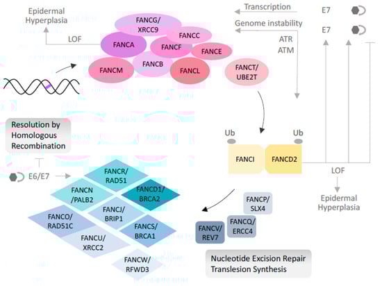 HPV virions contain circular double-stranded DNA genomes of approximately 8 kbp within an icosahedral capsid. For many high risk HPV types, the viral genome encodes six early (E) nonstructural, and two late capsid proteins (L1, L2). HPV gene expression is complex, involving a synchronization of transcription, mRNA stability, splicing, and polyadenylation with keratinocyte differentiation and distinct phases of the viral life cycle [,]. In the initial phase of the HPV life cycle, basal keratinocytes are infected by the virus that has permeated the above epidermal barrier through microwounds. The second phase is characterized by a short burst of viral genome amplification, followed by maintenance at 50–200 copies per cell. Upon upward migration and differentiation, the third phase, i.e., genome amplification, produces thousands of HPV copies in a fraction of keratinocytes in the granular and cornified layers. L1 and L2 expression and virus assembly are limited to these terminally differentiated layers. The switch from phase 2 (viral maintenance) to phase 3 (productive replication) is poorly understood, but is key to HPV disease and transmission, as it leads to the production of viral progeny that will infect the same or a different host. Therefore, the identification of regulators of HPV infection and amplification is a critical step towards new approaches to attenuate viral production. This review highlights how a DNA repair pathway, the Fanconi anemia pathway, interacts with HPV at a molecular, cellular, and epidemiological level and can help further our understanding of HPV pathogenesis and host response to identify potential targets for novel therapeutic interventions. As most of the studies cited below tested high-risk HPV subtypes, from this point on “HPV” will be used to refer to high-risk HPV, unless otherwise indicated.