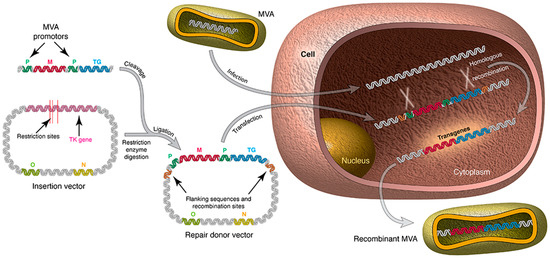 The broad host range of OPXVs may represent a potential risk of spill-over to non-target species, which is not always beneficial, but also allows to reach multiple target species, such as during the deployment of Raboral V-RG (RVG), a VACV-based recombinant Rabies vaccine that targets multiple wildlife reservoir species for rabies control and eradication programs in Europe and North America [9,10]. A major argument against the use of live OPXVs as vaccine vectors has been their potential of spontaneous recombination events with naturally occurring virus relatives, such as CPXV [11,12,13]. Single nucleotide polymorphisms (SNPs), insertions, deletions and genome rearrangements are commonly detected especially around the terminal inverted repeats, which affect the genome size and may be associated with altered infectivity and pathogenicity [14,15]. Although the replication-defective OPXV vectors are considered safer compared to replicative competent VACV, it is possible that a replicative-deficient and thus non-infectious virus may be recovered by the presence of a different poxvirus in the same cell; e.g., Shope fibroma virus can reactivate VACV DNA in infected and transfected cells [16,17]. These mechanisms are relevant when biosafety issues associated with open use or release of recombinant OPXVs are considered [18,19]; see also our recent review on biosafety considerations of MVA [20].