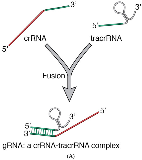 The CRISPR/Cas9 (Clustered Regularly Interspaced Short Palindromic Repeats (CRISPR)/associated protein 9) is one of the latest introductions to the tools of modern genome editing. Derived from the Streptococcus pyogenes Type II CRISPR/Cas system [43,44] where the gRNA (guide RNA)-guided cas gene targets and breaks DNA at specific sequences [45,46], CRISPR/Cas9 has been adapted to editing genomes of virtually any organism [43,44,47]. In bacteria and archae where it plays an important role in the adaptive immune defence process, CRISPR/Cas activity is generally characterized by (1) adaptation—which leads to insertion of new spacers in the CRISPR locus; (2) expression—which primes the system for action by expressing the cas gene and transcribing the CRISPR into, first a precursor CRISPR/RNA (crRNA), and then a mature crRNA; (3) interference—during which the target nucleic acid is recognized by its PAM (a conserved dinucleotide-containing Protospacer Adjacent Motif sequence upstream of the crRNA binding region) and nicked by the combined action of crRNA, a transactivating CRISPR RNA (tracrRNA) and Cas proteins [48]. In CRISPR/Cas9, crRNA and tracrRNA are fused to form sgRNA (single guide RNA) [45,46], which directs the Cas9 to the specific DNA sequence to be cut (Figure 1).