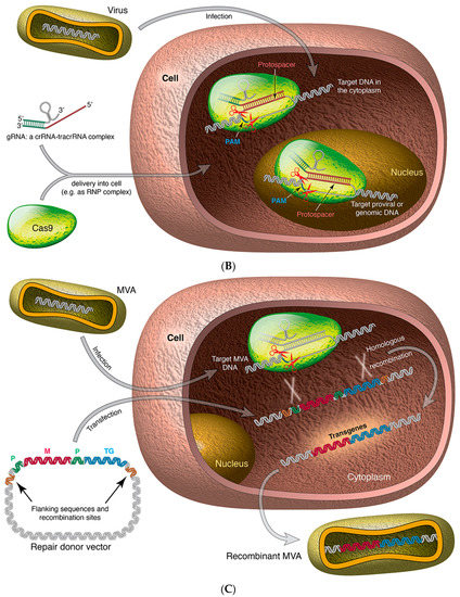 Several OPXV-based recombinant vaccines and vectors are currently at different stages of clinical trials. Many of the vaccines and vectors are based on VACV, MVA, NYVAC, Raccoon poxvirus, and modified Vaccinia Tian Tian (MVTT) OPXV strains, and they target malignancies (e.g., prostate, skin, colorectal, breast and ovarian cancer) [146,147,148,149]) and infectious diseases (e.g., AIDS, malaria, ebola, tuberculosis, hepatitis, influenza) (Supplementary Table S1). In many parts of Europe, Canada and USA, a VACV recombinant vaccine–Raboral V-RG was deployed to eradicate Rabies virus from the wild fox population [9,10], and several OPXV-based vectored vaccines have been used in preventing animal diseases [150]. Despite these advances, none of the OPXV-based recombinant vectors or vaccines has been licensed for human use. The main drawbacks include low predictability of attenuation; sub-optimal immunogenicity; transgene instability; potential for reversion of attenuation or to wild-type strain; potential of transmission to non-target hosts; and exchange of genetic materials with viral strains in the environment [20], which are some of the considerations for efficacy, patient’s safety and environmental safety during evaluation of genetically modified vaccines and vectors for approval [18,19,20]. Can the CRISPR/Cas9 system facilitate the development of OPXV-based recombinant vaccines with a superior level of immunogenicity, limited potential to spread to non-target host, relatively stable against reversion of attenuation, high predictable level of attenuation not offered by the classical methods?