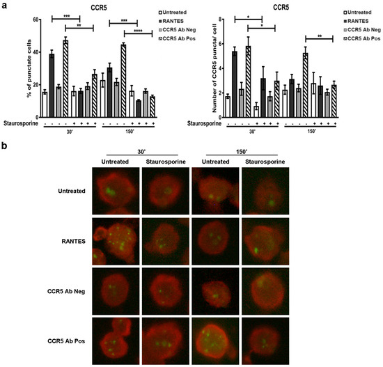Conversely, at 150 min, the stimulation with CCR5 Ab Pos, but not with RANTES, substantially increased (p ≤ 0.001) the percentage of cytoplasmic CCR5 puncta structures, as expected. In addition, the presence of staurosporine still determined a reduction both in the percentage of CCR5 positive cells (p ≤ 0.0001) and in the number of positive specific CCR5 puncta per cell (p ≤ 0.01), in the cells stimulated with CCR5 Ab Pos (Figure 1).