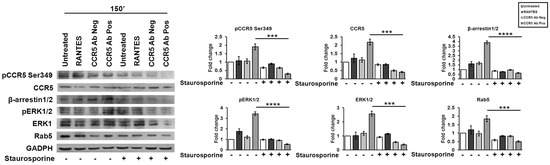 A parallel Western blot analysis of the lysates was done to prove that the staurosporine treatment can also affect the accumulation of the proteins involved in the CCR5 signalosome complex. As shown in Figure 2b, the staurosporine treatment statistically significantly reduced the retention of β-arrestin1/2 and ERK1 (p ≤ 0.001) in the cells incubated with CCR5 Ab Pos compared to the non-treated control ones, at 150 min. Furthermore, the inhibition of protein kinases activity statistically significantly affected the accumulation of Rab5 protein, both at 30 min (p ≤ 0.01) and 150 min (p ≤ 0.0001), upon stimulation with CCR5 Ab Pos. As expected, the cells stimulated with RANTES and treated with staurosporine showed a statistically significant decrease of β-arrestin1/2 (p ≤ 0.01) and Rab5 (p ≤ 0.001) at 30 min only.