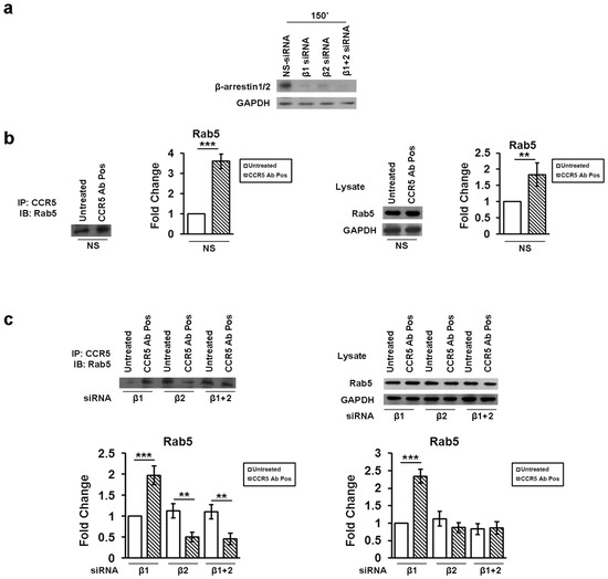 We performed an immunoprecipitation assay, in the cells nucleofected or not with siRNAs specific for β-arrestin1 and -2, to determine the possible interaction between the endogenous Rab5 protein and the internalized CCR5 receptor. At 150 min, Rab5 had a weak basal level interaction with the receptor and it was strongly engaged to CCR5 upon stimulation with CCR5 Ab Pos in the cells nucleofected with non-specific targeting siRNA (NS-siRNA) (Figure 4b). Moreover, the depletion of cellular level of β-arrestin1 did not affect the CCR5 Ab Pos-specific accumulation (Figure 4c); on the contrary, the silencing of β-arrestin2 or of both β-arrestin1 and -2, showed a decrease in the complex formation as shown by the weaker Rab5 binding (Figure 4c).