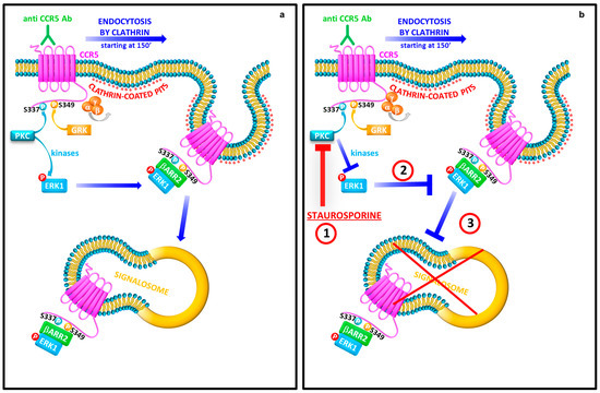 A mechanistic model of CCR5 signalosome formation mediated by CCR5 Ab Pos. CCR5 Ab Pos triggers the receptor phosphorylation GRK-mediated with the recruitment of β-arrestin2. (a) Remarkably, β-arrestin2 accumulates in complexes in association with the activated CCR5 and triggers the activation of ERK1, with consequent retention, into the cytosol (150 min); (b) the block of the protein kinases phosphorylation mediated by staurosporine treatment (1), which in turn has an effect on both CCR5 and ERK1 (2), resulting in the abolition of the accumulation of CCR5 into the early endosome after binding with CCR5 Ab Pos (3).