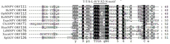 Multiple-sequence alignment of 10 selected Ac111 homologues. The alignment was performed and edited using Clustal X and GeneDoc, respectively. The Ac111 homologue sequences used are as follows: NP_054141.1 for AcMNPV ORF111, YP_473232.1 for HcNPV ORF44, NP_046268.1 for OpMNPV ORF112, AAN28146.1 for RoMNPV ORF106, YP_002854670.1 for EupsNPV ORF60, YP_249675.1 for ChchNPV ORF71, NP_203672.1 for HearNPV ORF116, NP_047713.1 for LdMNPV ORF76, NP_059308.1 for XecnGV ORF160, and YP_001257077.1 for SpliGV ORF126. Black, dark gray, or light gray shading denote 100%, 80%, or 60% conservation, respectively. The predicted T-T/S-L-H/Y-X2-N motif found in all of the homologues is indicated.