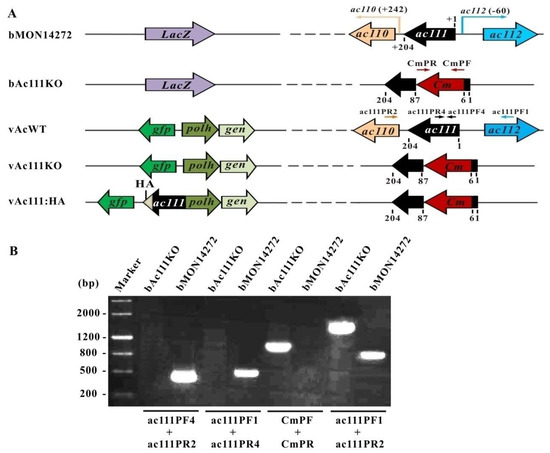 Based on AcMNPV transcriptomics [32], the 5′ transcription start site of ac110 is located 38 nt downstream of the 3′ end of ac111, and the 5′ transcription start site of ac112 is located 59 nt upstream of the initiation codon ATG of ac111. To investigate the role of Ac111 in the baculovirus life cycle, the ac111-knockout bacmid, bAc111KO, was constructed via the λ Red recombination system, as described previously [7]. In bAc111KO bacmid, 6 nt of the 5′-end and 118 nt of the 3′-end of ac111 ORF were retained to avoid affecting the transcription of ac110 and ac112; an 80-bp region of ac111 was deleted and replaced with a 1038-bp Cm cassette (Figure 2A).