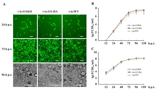 In order to facilitate the observation of the viral infection progress, the polh gene of AcMNPV and the gfp gene were inserted into the polh locus of bAc111KO via Tn7-mediated transposition to construct the ac111-knockout AcMNPV, vAc111KO, as described previously [45]. To confirm the phenotype observed in vAc111KO resulted from the deletion of ac111, a rescue virus, vAc111:HA, was constructed by inserting the ac111 gene under the control of its native promoter with an HA tag prior to the ac111 stop codon, along with the polh and gfp genes, into the polh locus of bAc111KO (Figure 2A). Similarly, a wild-type AcMNPV control, vAcWT, was generated by inserting the polh and gfp genes into bMON14272 (Figure 2A).
