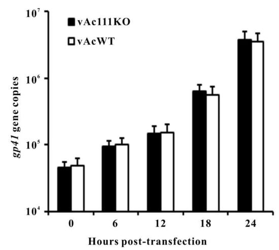 To assess whether ac111 deletion leads to a defect in viral DNA replication, qPCR was performed to measure the levels of viral DNA synthesis in vAc111KO-transfected cells during a single replication cycle. vAcWT was used as a positive control. Total cellular DNA was isolated from vAc111KO- or vAcWT-transfected cells at the designated time points, and treated with DpnI to eliminate all input bacmid DNA. As shown in Figure 4, viral DNA replication levels of vAc111KO-transfected cells and vAcWT-transfected cells were comparable throughout a 24-h time course. The qPCR results demonstrated that the deletion of ac111 did not affect the onset or levels of viral DNA synthesis.