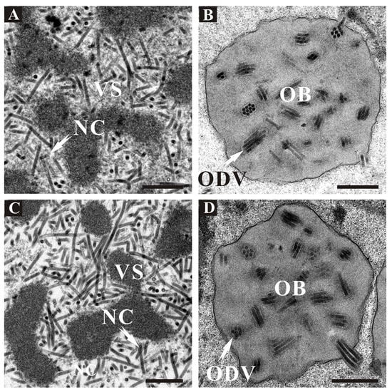 Electron microscopy observations were performed using thin sections of vAc111KO-, vAcWT-, and vAc111:HA-transfected Sf9 cells at 72 h p.t., to further investigate whether the ac111 deletion had any effect on virus morphogenesis (Figure 5). In vAc111:HA-transfected Sf9 cells, the typical characteristics were similar to those of vAcWT-transfected cells, including a well-defined virogenic stroma (VS) enriched with electron-dense, rod-shaped nucleocapsids in the center of the nucleus (Figure 5A), and developing OBs embedding numerous mature ODVs in the ring zone (Figure 5B). The cells transfected with vAc111KO exhibited morphologically indistinguishable characteristics to those of vAc111:HA and vAcWT (Figure 5C,D). These results indicated that the deletion of ac111 did not affect virus morphogenesis.