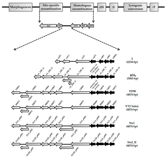- Bloch, S.; Nejman-Falenczyk, B.; Dydecka, A.; Łoś, J.M.; Felczykowska, A.; Wegrzyn, A.; Wegrzyn, G. Different expression patterns of genes from the exo-xis region of bacteriophage λ and Shiga toxin-converting bacteriophage Φ24B following infection or prophage induction in Escherichia coli. PLoS ONE 2014, 9, e108233. [Google Scholar] [CrossRef] [PubMed]