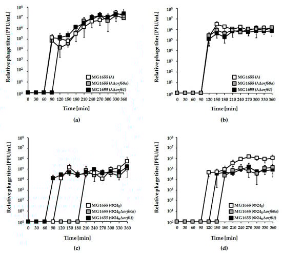 Next, we tested the effects of orf60a or orf61 deletions on infection of host cells by λ and Φ24B phages. In one-step growth experiments, no significant effects were observed (Figure 4).