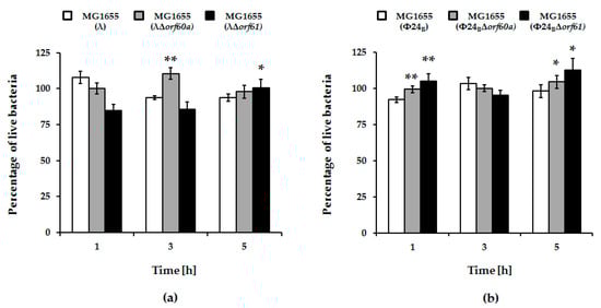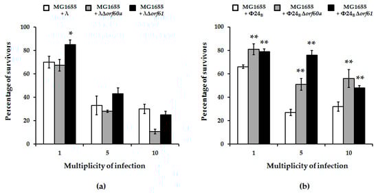 Percentage of survivors of E. coli MG1655 bacteria after infection of wild-type phages: λ (panel (a); white columns) and Φ24B (panel (b); white columns) or their deletion mutants: λΔorf60a (panel (a); grey columns), λΔorf61 (panel (a); black columns), Φ24BΔorf60a (panel (b); grey columns), and Φ24BΔorf61 (panel (b); black columns). Results are presented as mean values ± S.D. from three biological experiments. A t-test was performed for results from each multiplicity of infection (m.o.i.). The significance of differences between fractions of bacterial cells infected with wild-type phages and their deletion mutants are marked by asterisks, p < 0.05 (*) or p < 0.01 (**).